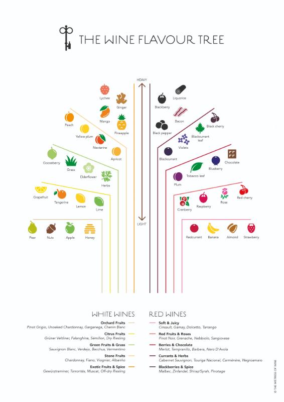 El árbol de sabores del vino es un diagrama ramificado que busca ordenar y jerarquizar aromas, primero por familia y luego por descriptores. En el tronco se sitúan las familias aromáticas principales: frutales, florales, vegetales, especiados, empireumáticos, minerales y animales/lácticos. De cada una surgen ramas secundarias y, finalmente, hojas que representan descriptores específicos.